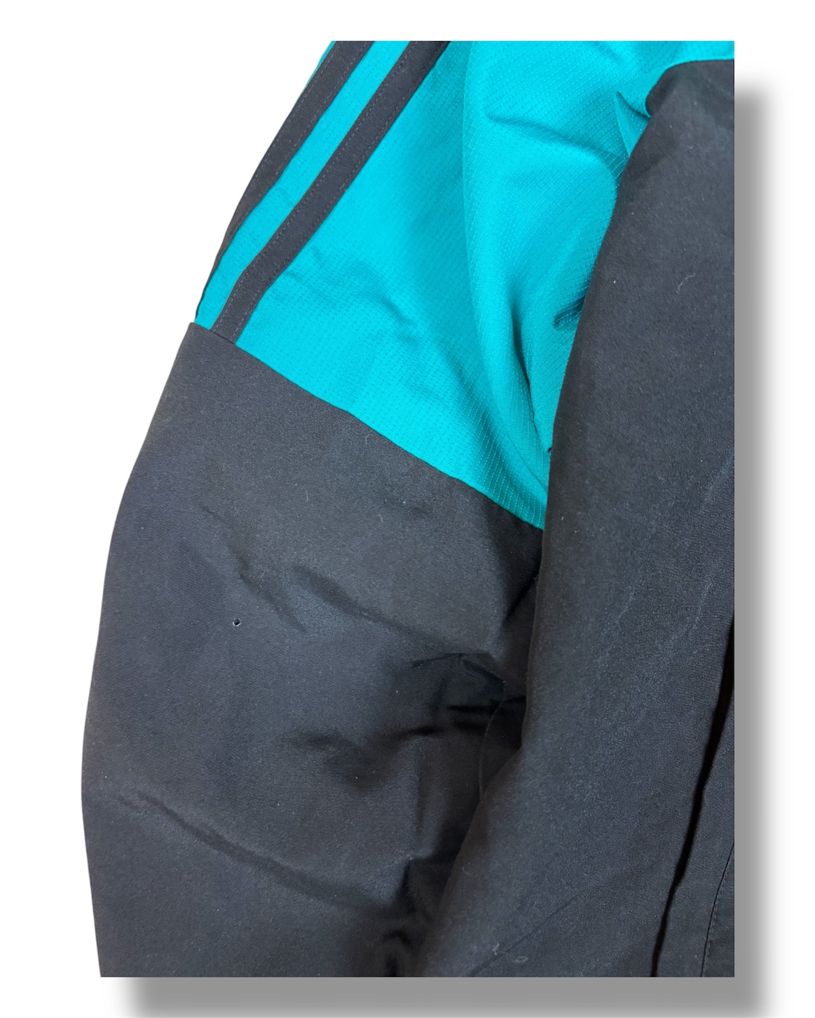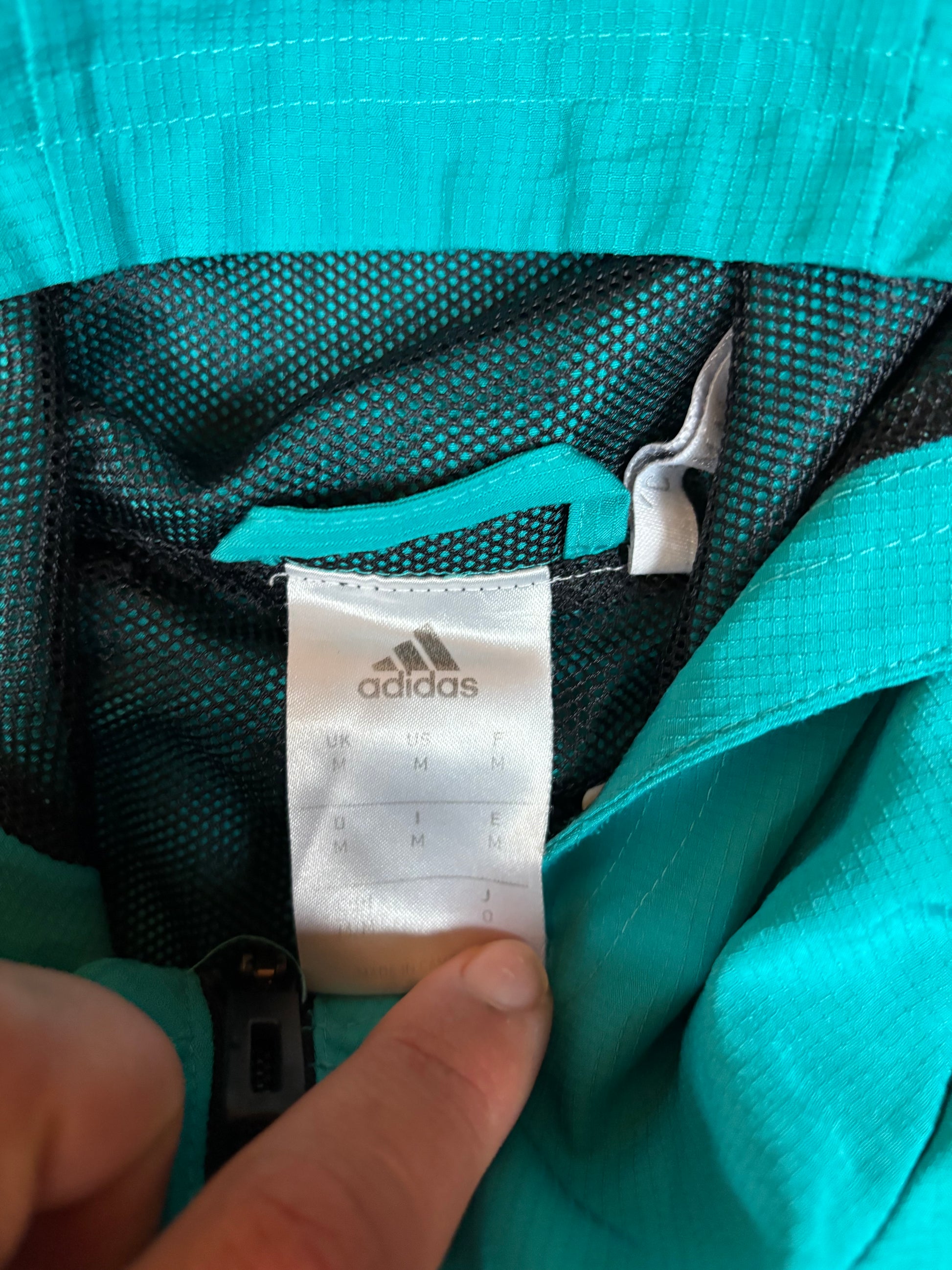 Vintage Real Madrid Adidas Jacke in Türkis/Schwarz mit Kapuze und gesticktem Vereinslogo.
