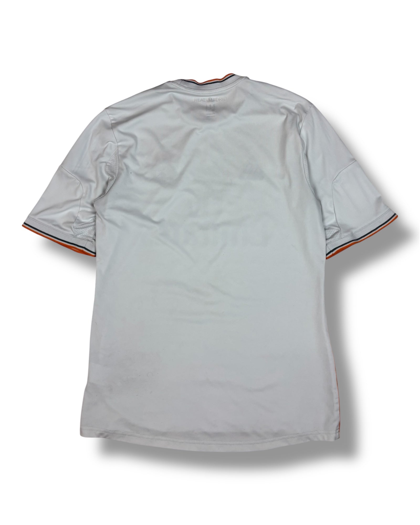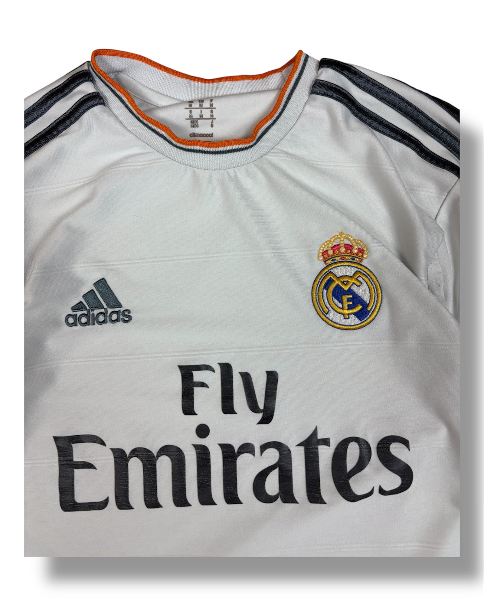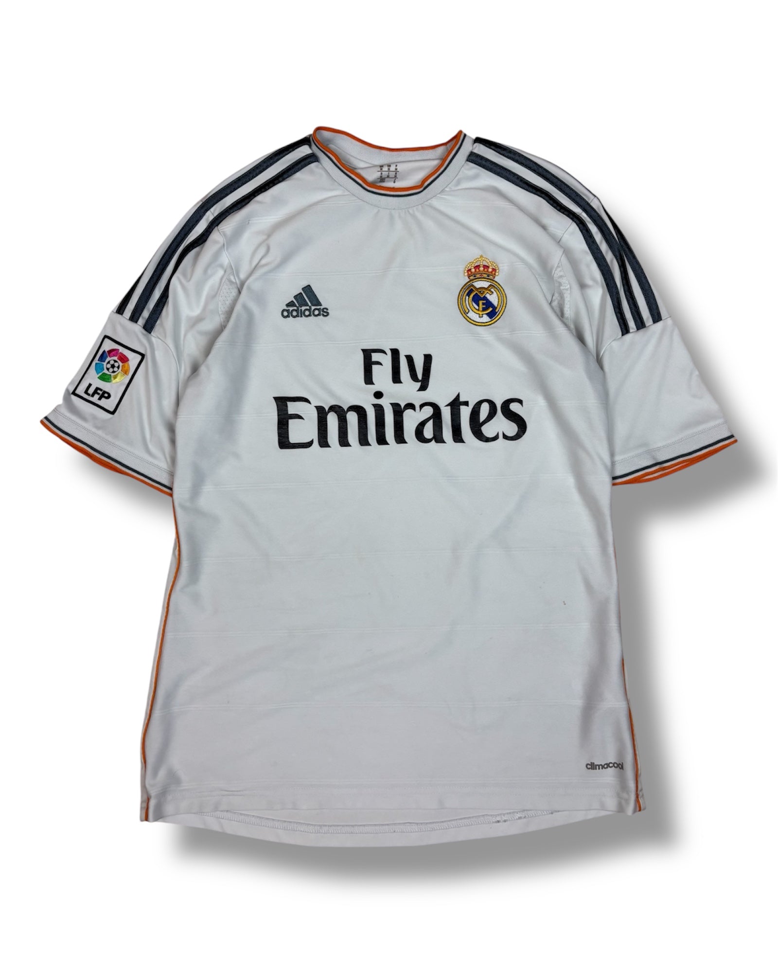 Vintage Real Madrid Adidas Jersey in Weiß mit Fly Emirates Sponsor, gesticktem Vereinswappen und LFP-Patch am Ärmel.