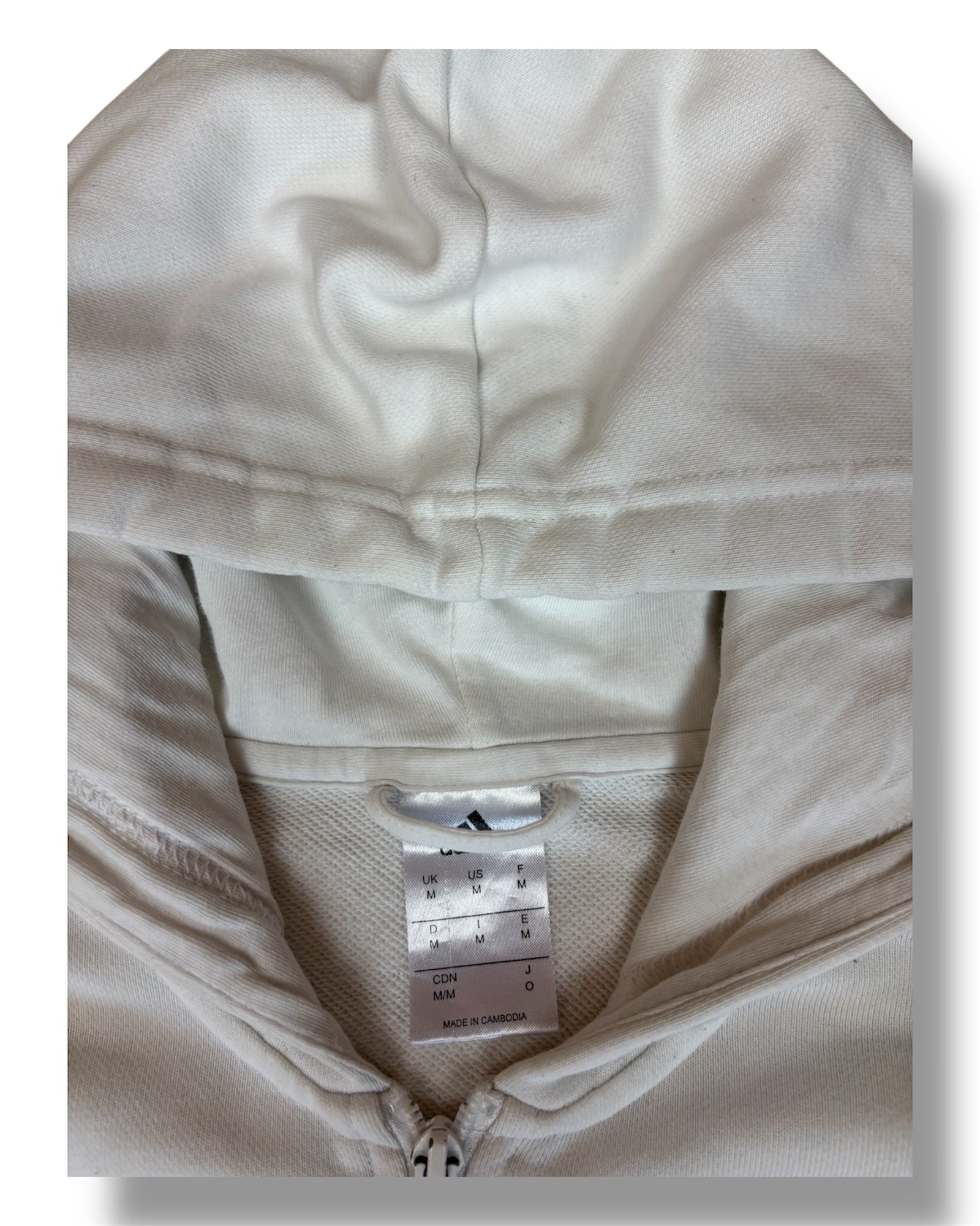 Weißer Adidas Zip-Hoodie mit Real Madrid Vereinswappen auf der Brust und den klassischen 3-Streifen an den Ärmeln. Sportlicher Look mit Kapuze.