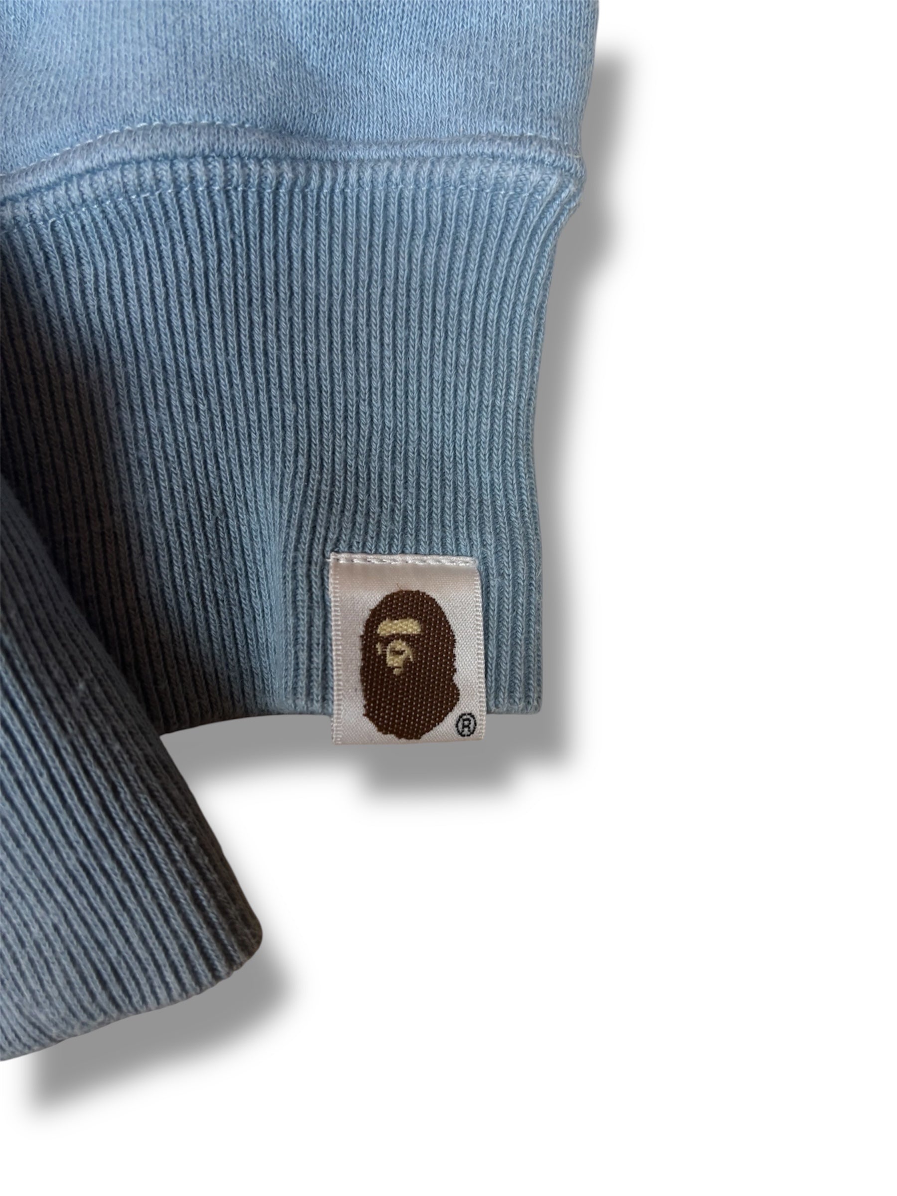 Blauer BAPE (A Bathing Ape) Sweater mit großem Frontprint und „Bathing Ape“-Schriftzug. Lockerer, cropped Fit.