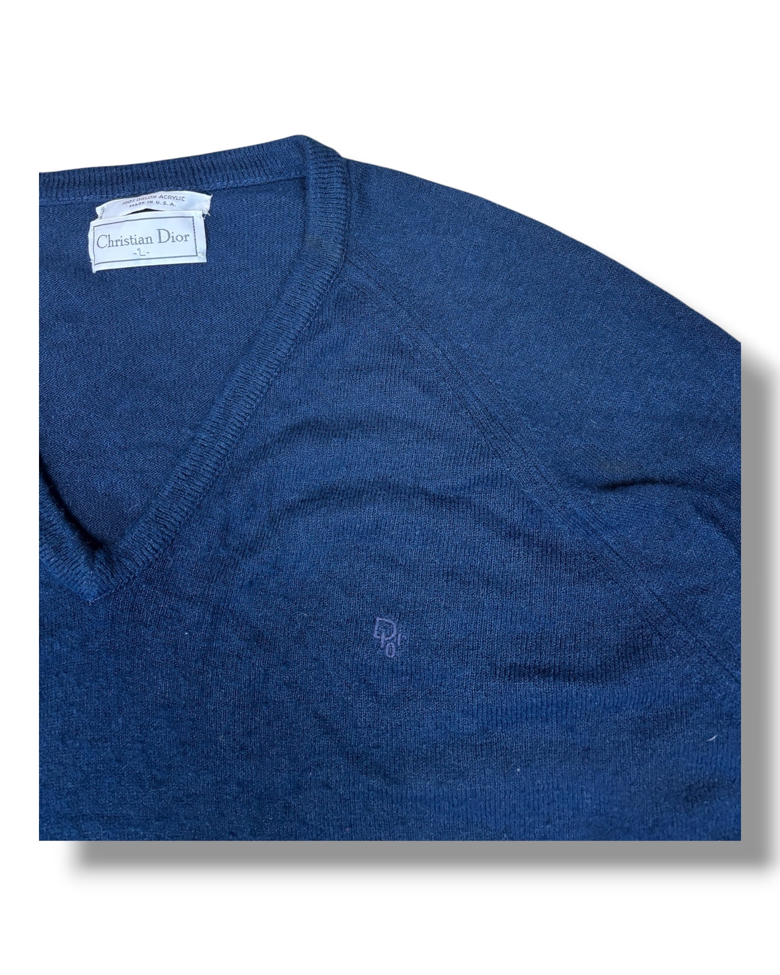Dunkelblauer Christian Dior Pullover mit V-Ausschnitt und dezentem Logo auf der Brust.