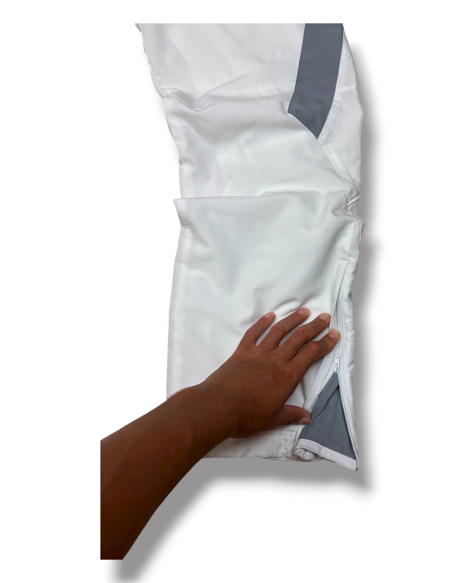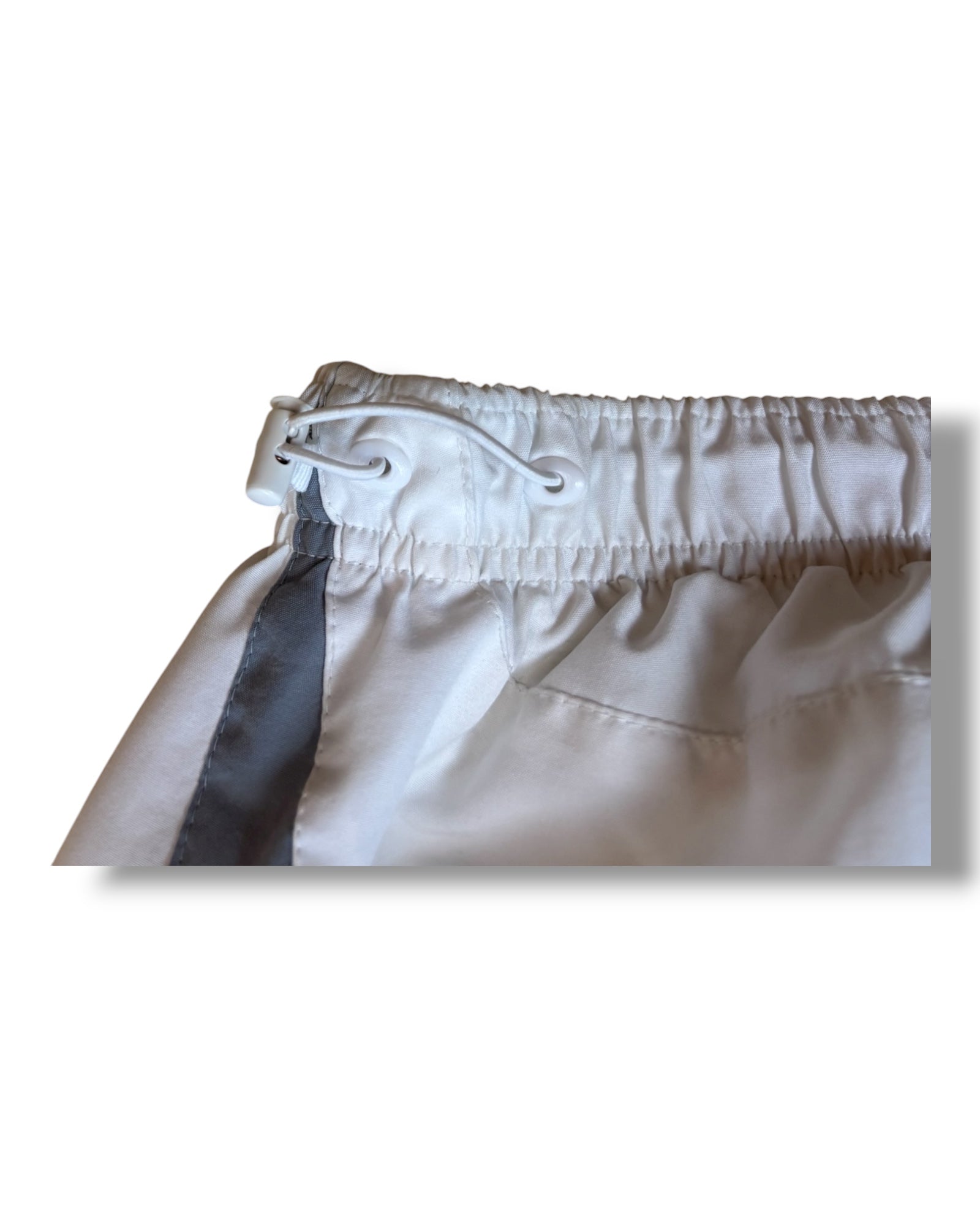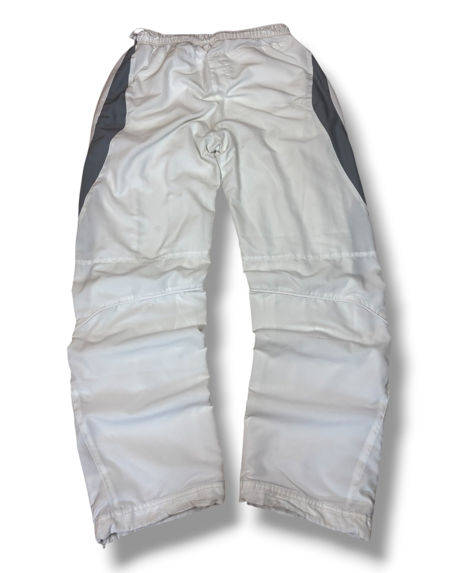 Weiße Nike Trackpants mit grauen Einsätzen an den Seiten, seitlichen Taschen und Reißverschlüssen an den Beinenden. Elastischer Bund mit Kordelzug für perfekten Sitz, Nike Logo auf der Vorderseite.