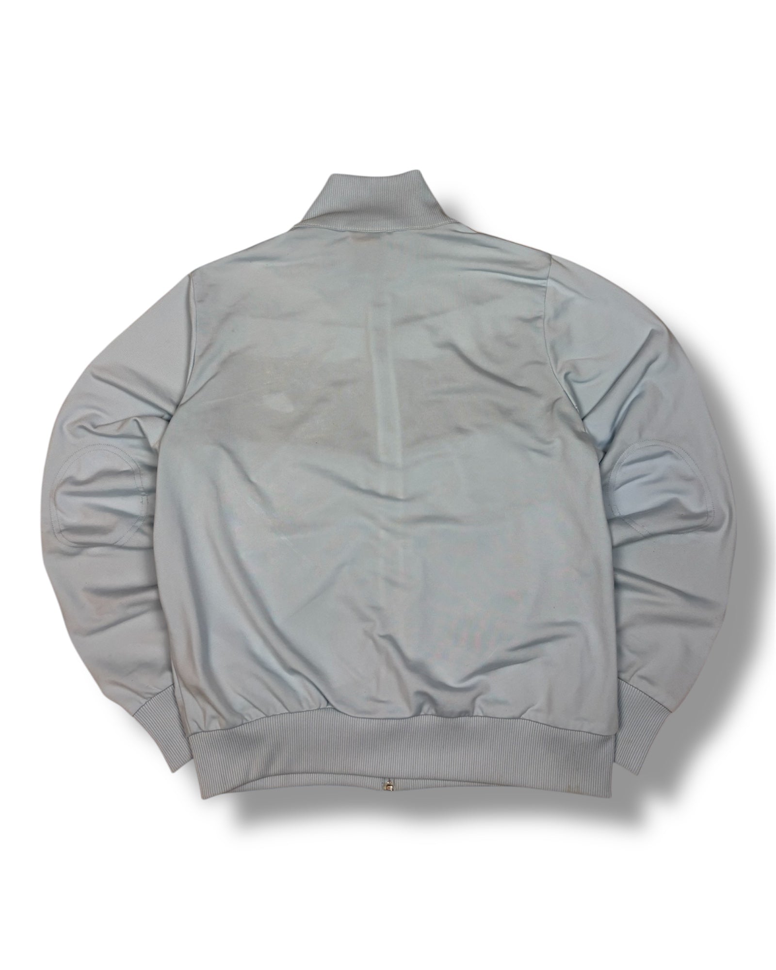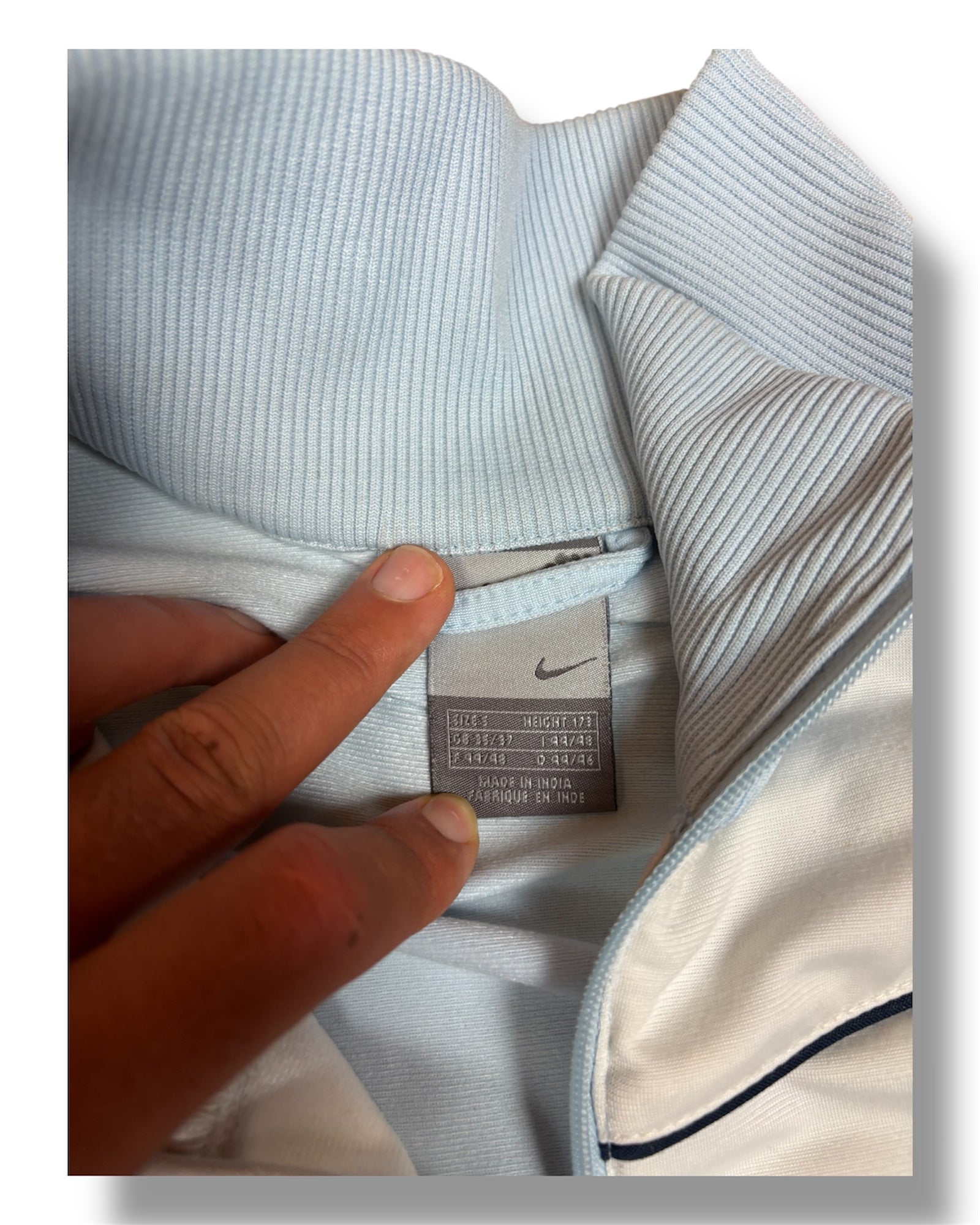 Vintage Nike Track Jacket in Hellblau mit weißen und schwarzen Einsätzen auf der Brust. Klassischer Zip-Jacket Style mit gesticktem Logo.