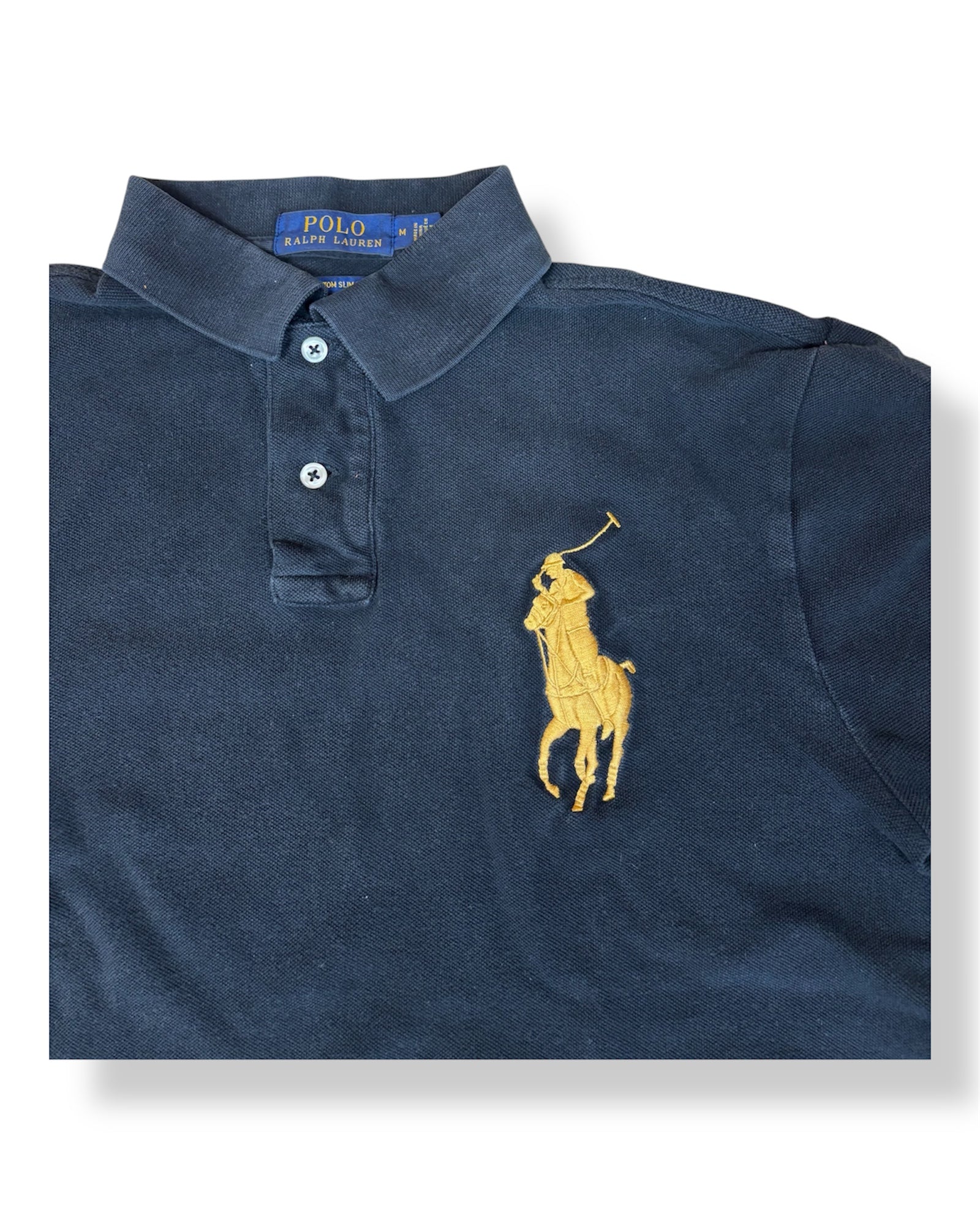 Klassisches Ralph Lauren Polo in Schwarz mit großem goldenen Reiter-Logo auf der Brust und der ikonischen „3“ auf dem Ärmel. Zeitlos und clean – lässt sich easy kombinieren.
