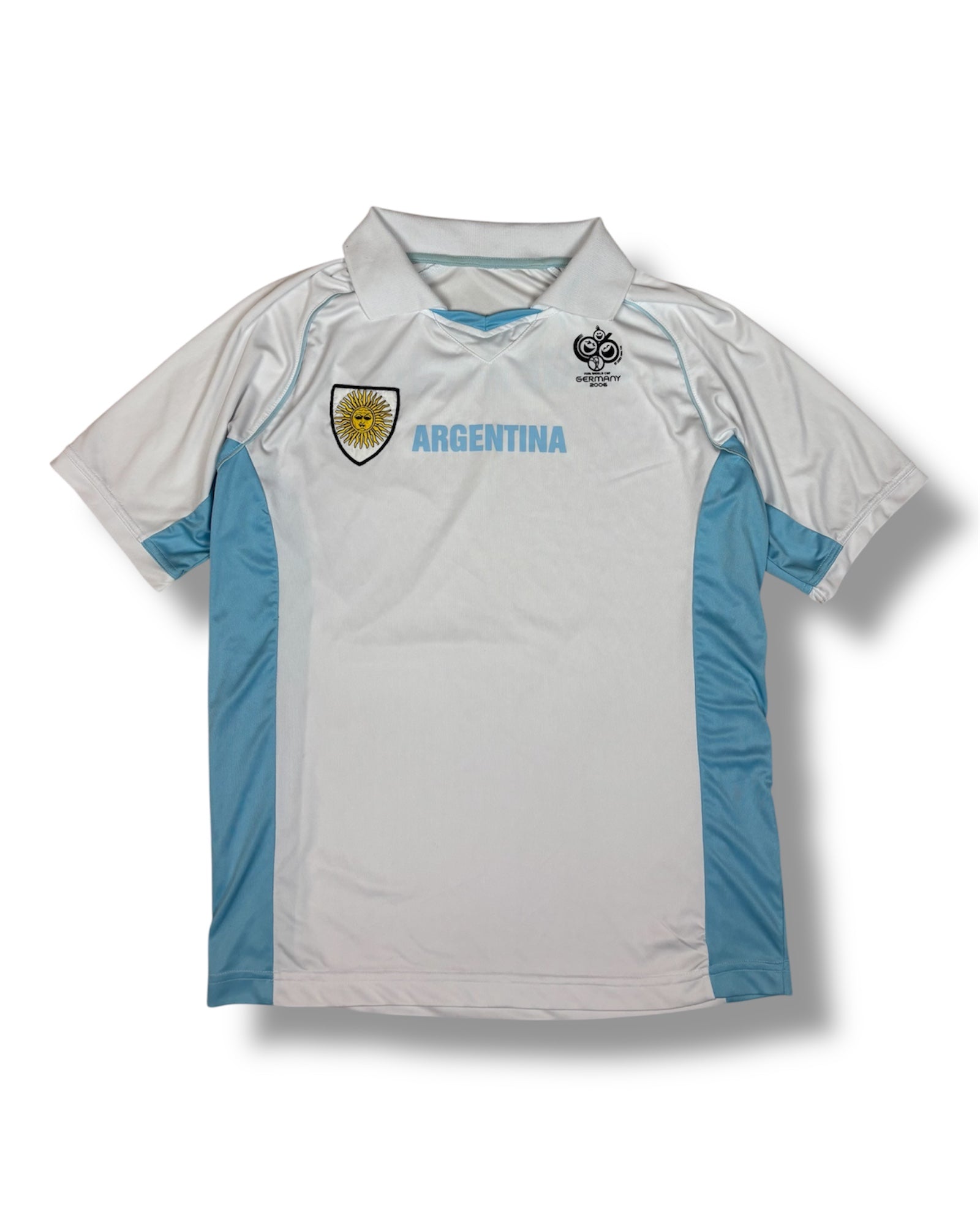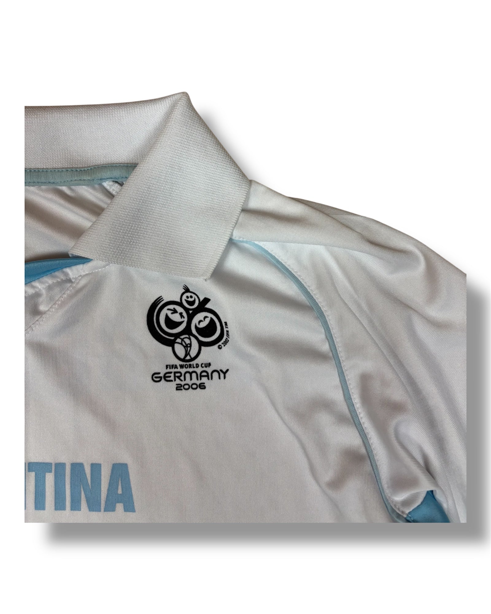 Weiß-blaues Argentinien Trikot mit Sonnensymbol und FIFA Germany 2006 Logo auf der Brust.