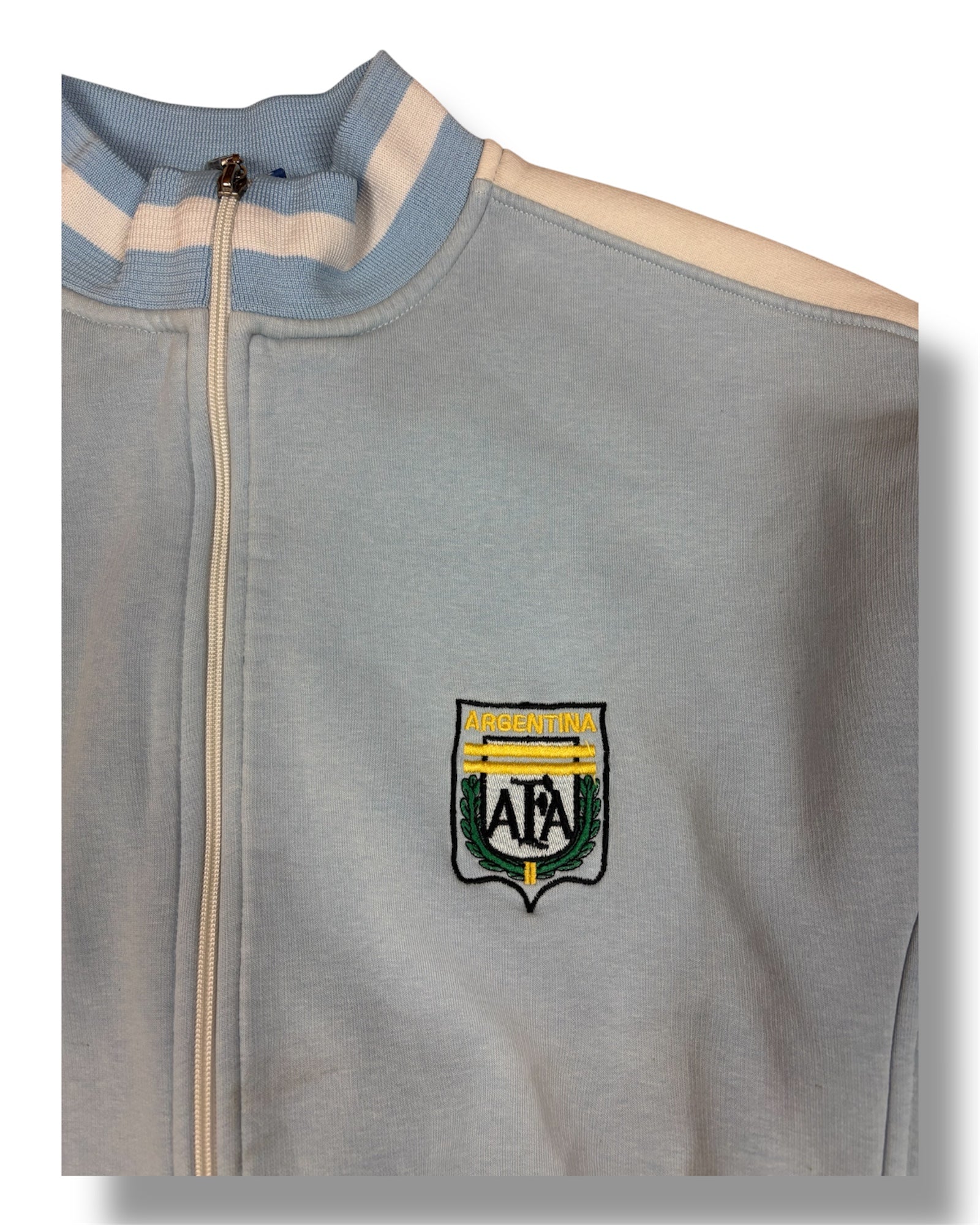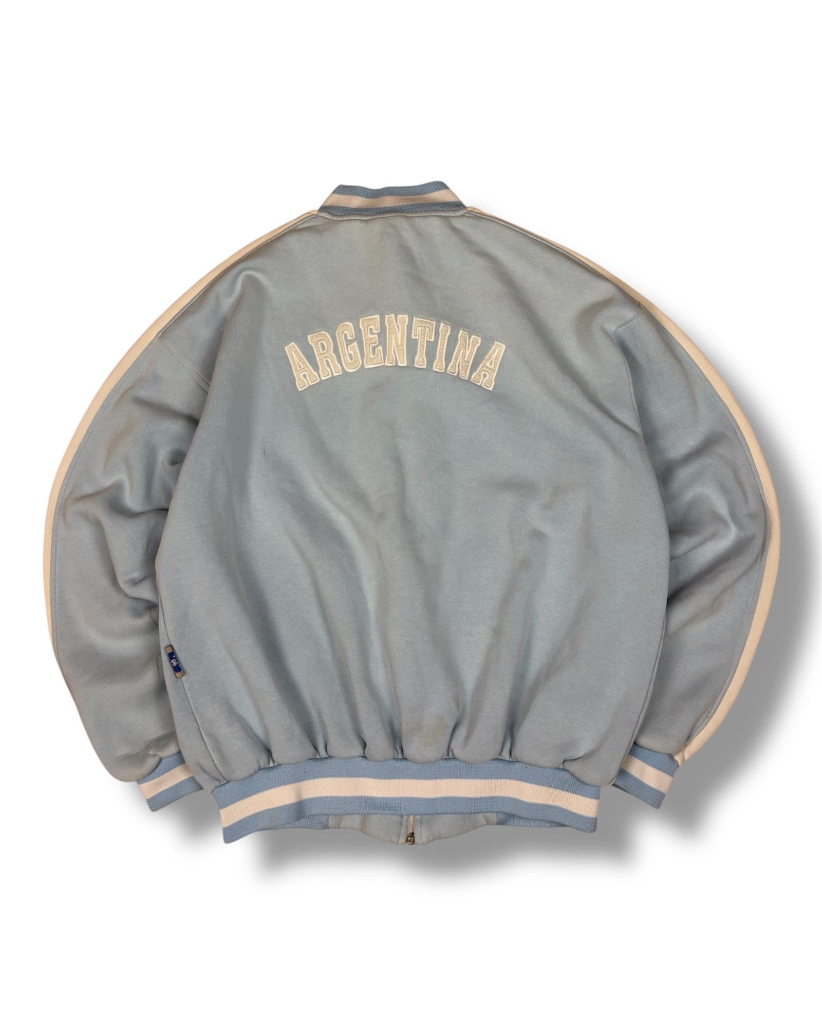 Vintage Argentinien Jacke in Hellblau mit AFA-Wappen vorne und großem „Argentina“-Schriftzug auf dem Rücken. Sportlicher Retro-Look