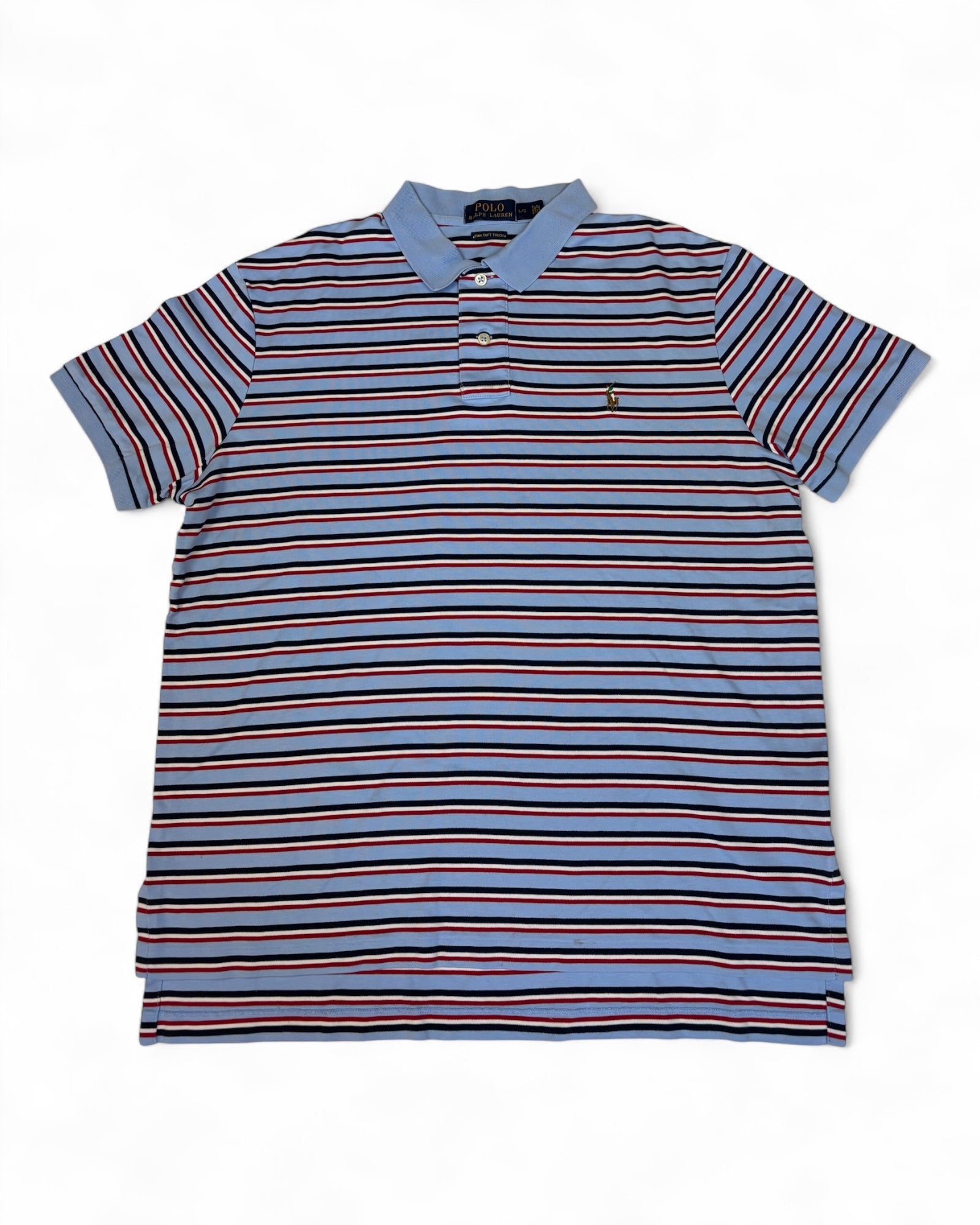 Ralph Lauren Polo in Hellblau mit feinen Streifen in Navy, Rot und Weiß. Farblich abgestimmt, lockerer Fit, stabil verarbeitet.
